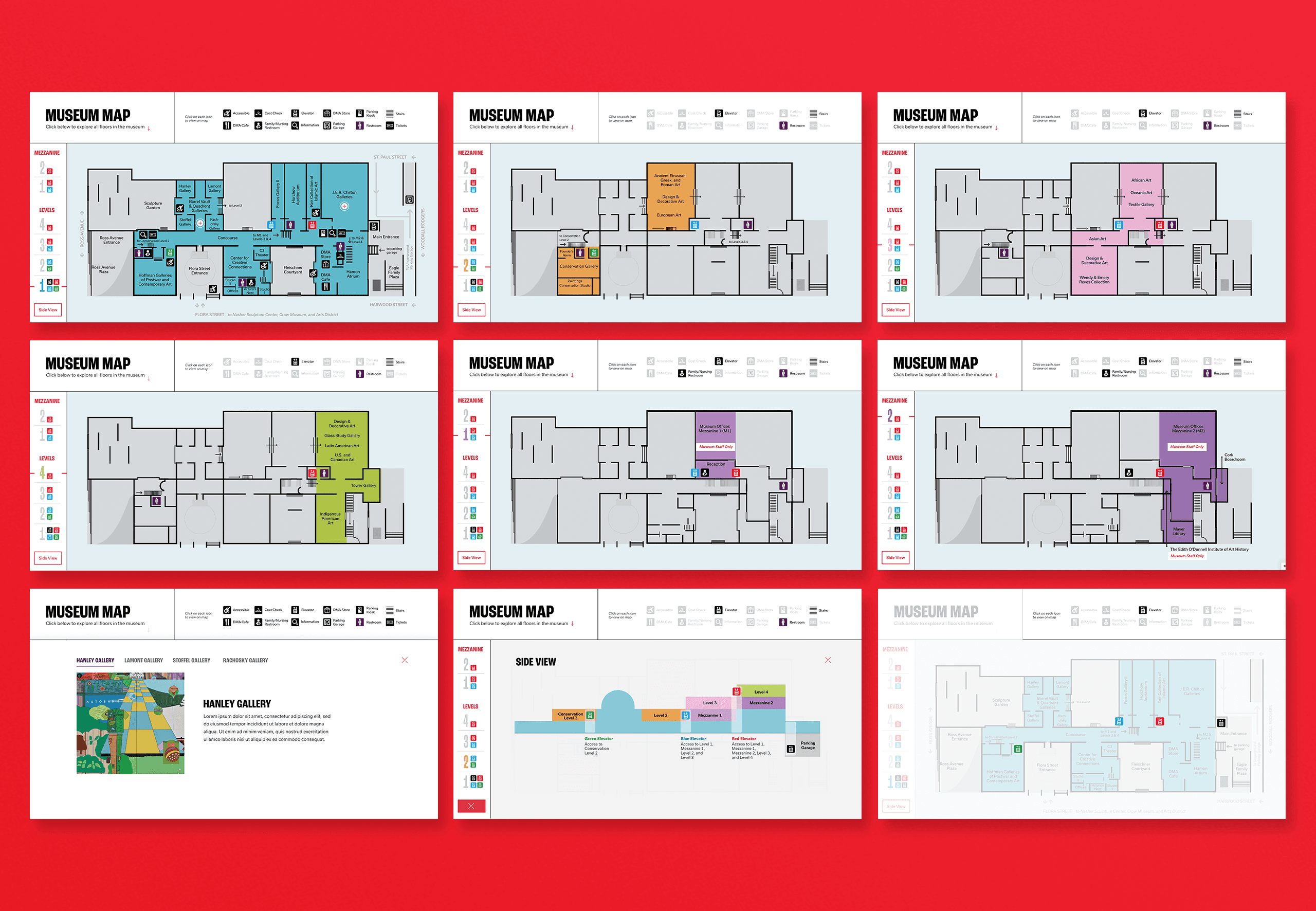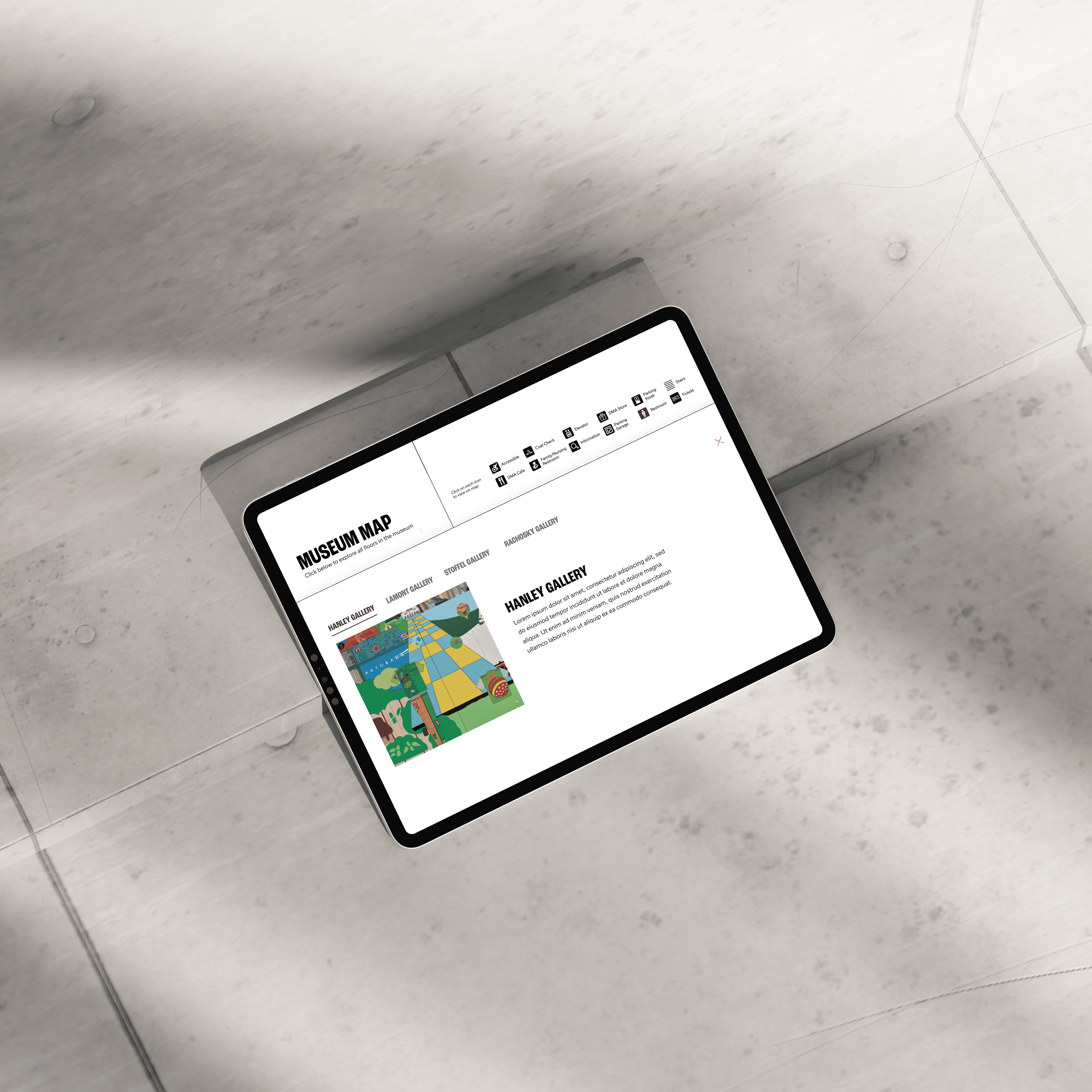 DMA’s interactive map was driven by a vision of improved accessibility and interactivity. Their existing map–a static PDF displaying all floors at once–often felt overwhelming for visitors, highlighting the need for a more modern, user-friendly solution. In collaboration with DMA’s creative team and my team at Ceros, we brought this vision to life by reimagining the map as an intuitive, interactive experience.