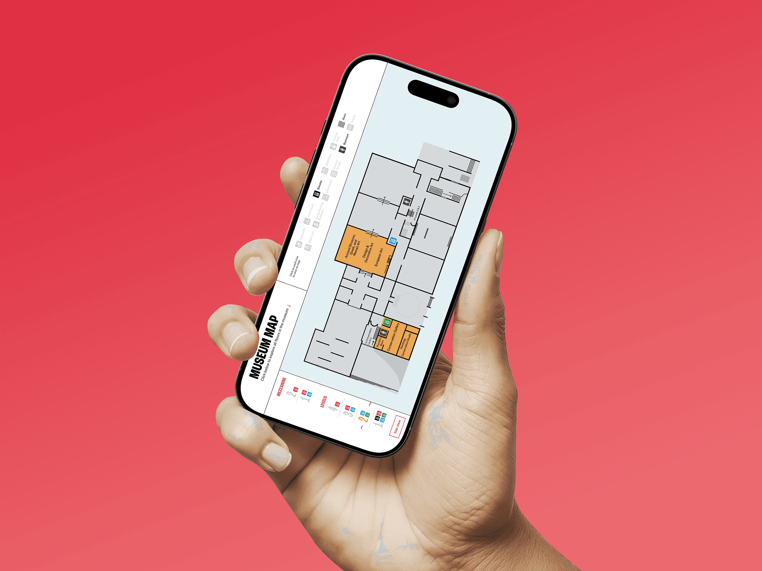 Using DMA’s original source files and existing PDF as a foundation, I redesigned the map to fit within a single viewport, which ensured the entire experience was easily viewable on mobile, the primary use-case for on-site visitors. To reduce visual and cognitive overload, floors were organized into a filter-based module, allowing users to quickly switch views and understand where exhibitions were located.